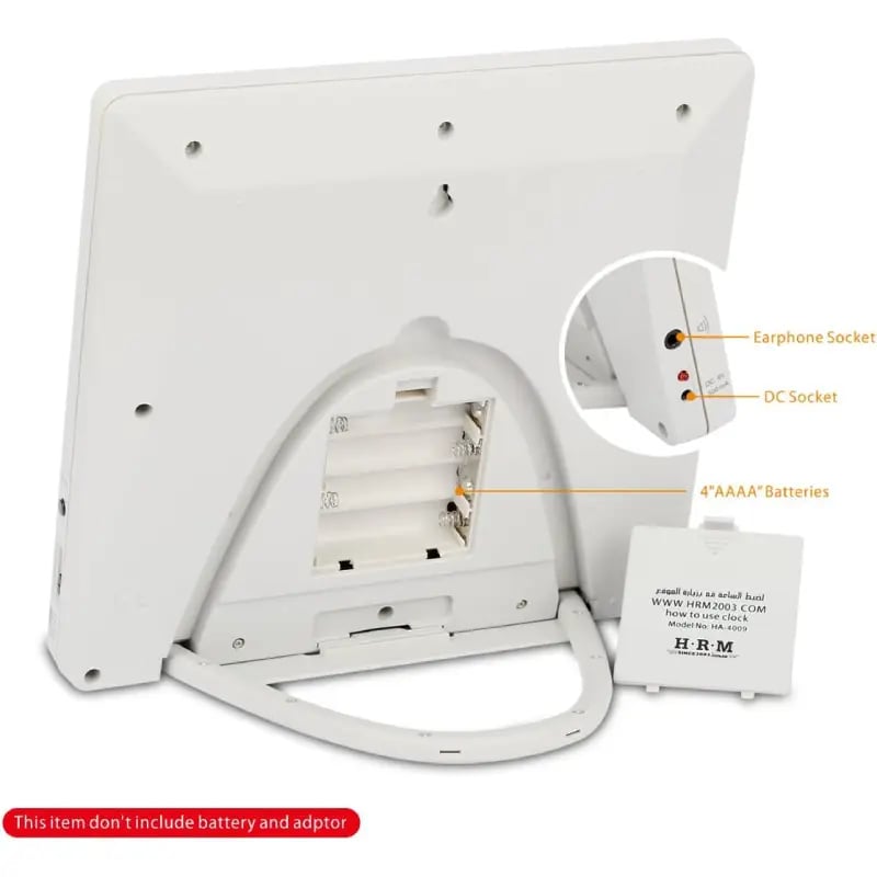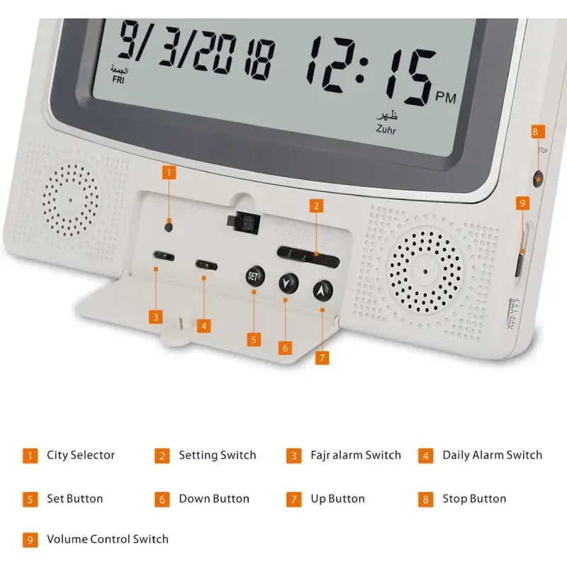 - شاشة رقمية واضحة وسهلة القراءة، تعرض الوقت والتقويم الإسلامي بشكل واضح ومريح للعين.
