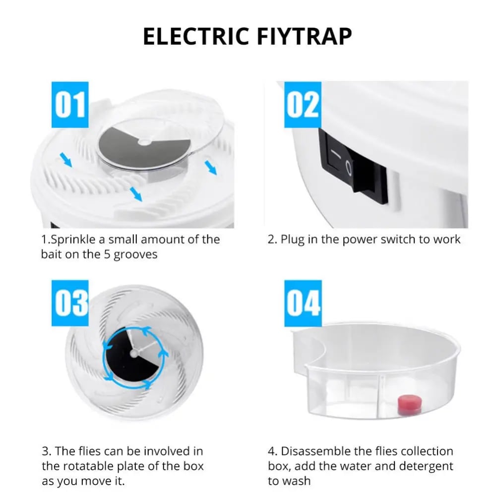- يجذب الطُعم الذباب الذي يتم نقله إلى صندوق المصيدة عبر اللوحة الدوّارة.