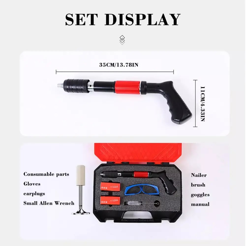 تم تصميم هذا الجهاز لتثبيت المسامير بسرعة وكفاءة على جميع أنواع الأسطح مثل الخرسانة، الخشب، الطوب، والمعدن. مع تصميم مريح ومتانة فائقة، يعد هذا المسدس الأداة المثالية لكل أعمال التثبيت.