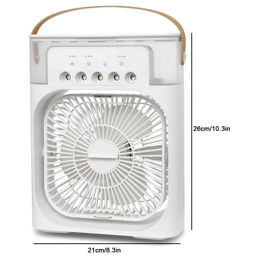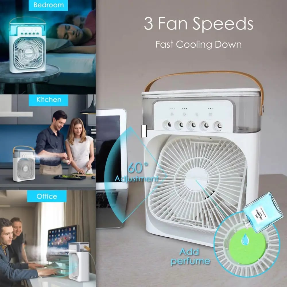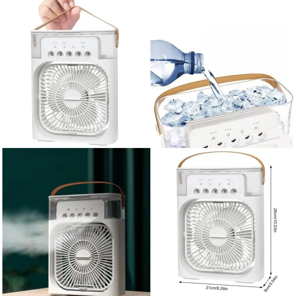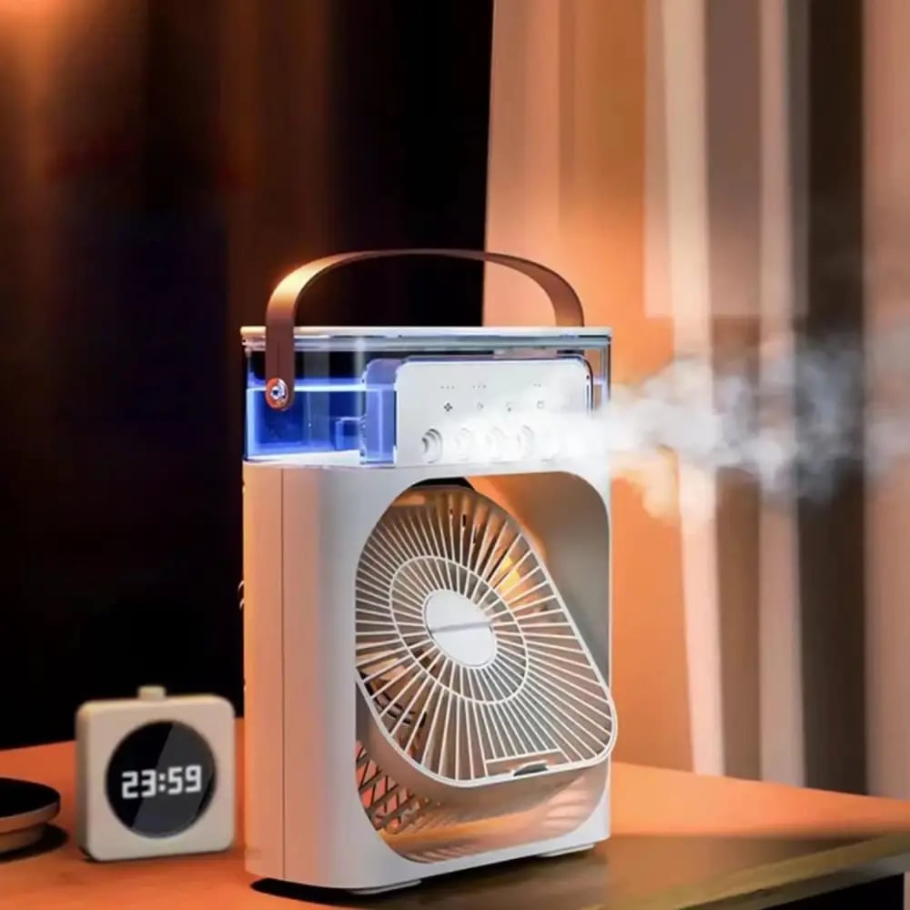 استمتع بجو منعش ولطيف مع مروحة التبريد المحمولة 3 في 1! جهاز عملي يجمع بين مروحة قوية، رذاذ ماء منعش، وفواحة لترطيب وتنقية الهواء، مما يجعله البديل المثالي للتكييف الصحراوي الصغير.